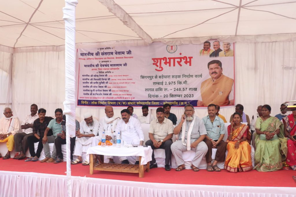 उक्त बातें छत्तीसगढ़ विधानसभा उपाध्यक्ष व केशकाल विधायक संतराम नेताम ने ग्राम सिंगनपुर में बहुप्रतीक्षित सड़क निर्माण कार्य के भूमि पूजन के दौरान कही। विधायक संतराम नेताम के द्वारा केशकाल विकासखंड में अपने एक दिवसीय दौरे पर ग्राम पंचायत सिंगनपुर में लोक निर्माण विभाग द्वारा 248.57 लाख की लागत से बनने वाले सड़क निर्माण कार्य का विधिवत भूमि पूजन किया गया। इस दौरान जनप्रतिनिधि एवं ग्रामीण जन बड़ी संख्या में उपस्थित रहे। उल्लेखनीय है कि लंबे समय से ग्राम सिंगनपुर के ग्रामवासियों के द्वारा सड़क की मांग कर रहे थे। जिसे विधायक संतराम नेताम ने गंभीरता से लेते हुए प्रदेश के यशस्वी मुख्यमंत्री भूपेश बघेल जी एवं विभागीय मंत्री से मांग रखी थी जिसे स्वीकृति प्रदान की गई है जिससे क्षेत्र में खुशी की लहर है।